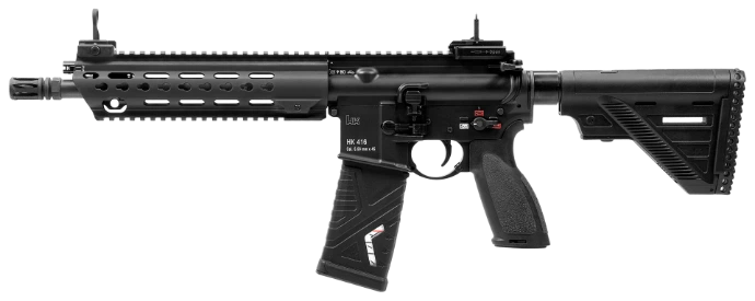 The HK416 features a modular aluminum receiver system with a free-floating barrel and integrated rail interface, providing a rigid and adaptable platform for optics and accessories.